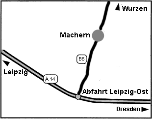 A14: Autobahnabfahrt (Nr. 26) Leipzig-Ost, Richtung Wurzen auf der Bundesstrasse B6 auffahren und ca.10 km folgen.